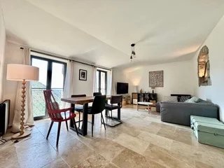 Un grand salon panoramique, une cuisine équipée, salle de bain et wc, à l'étage inférieur un espace bureau, une salle de jeux pouvant également servir de dressing , et 2 chambres avec grande terrasse ( pergola, store banne)